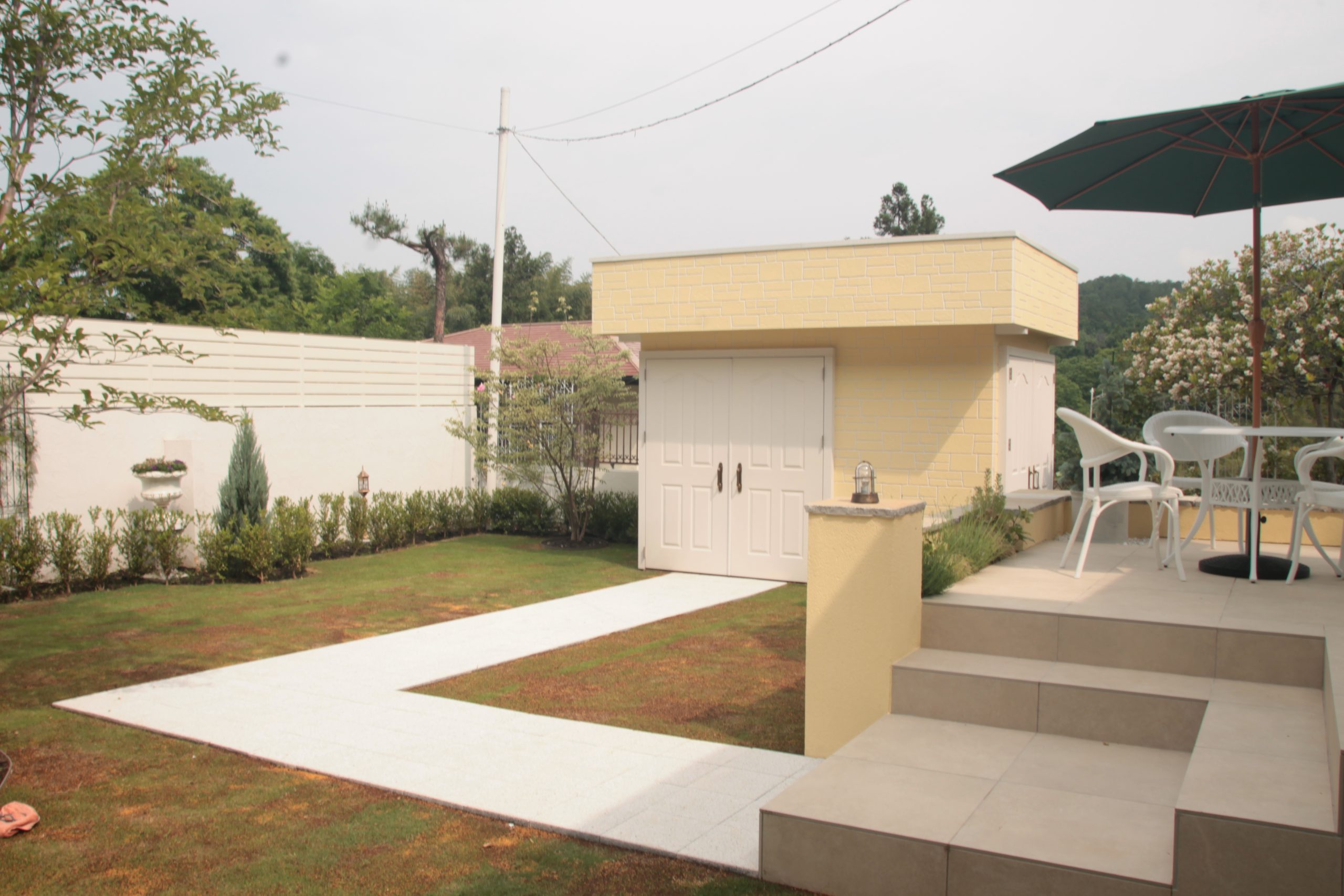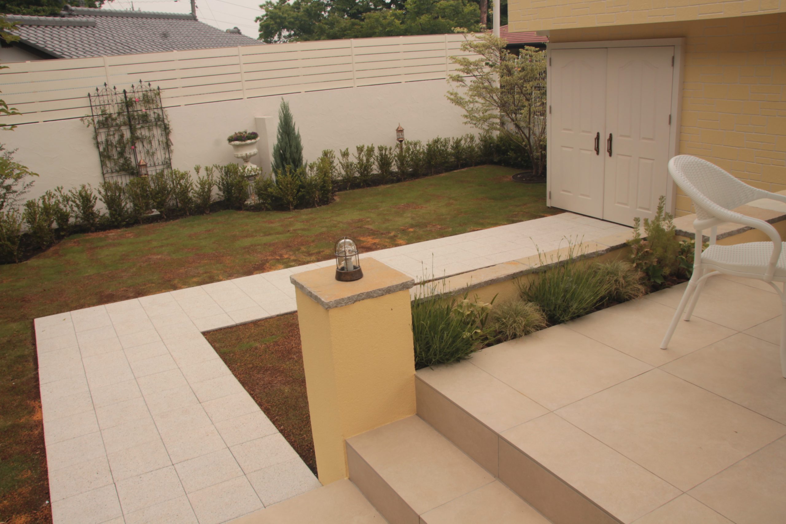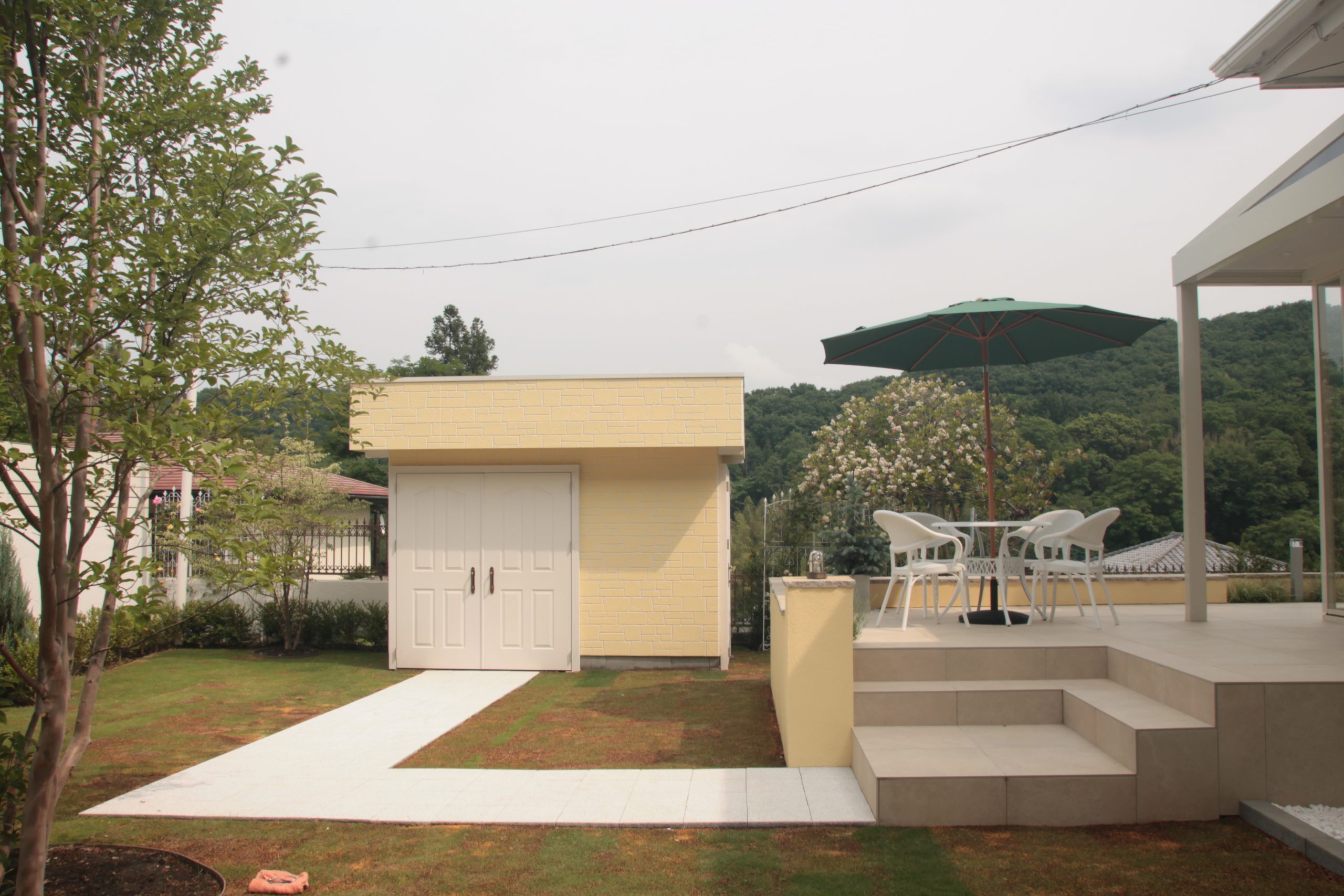 物置からテラスまでは透水性のインターロッキング ソルベ(ホワイト)を採用。