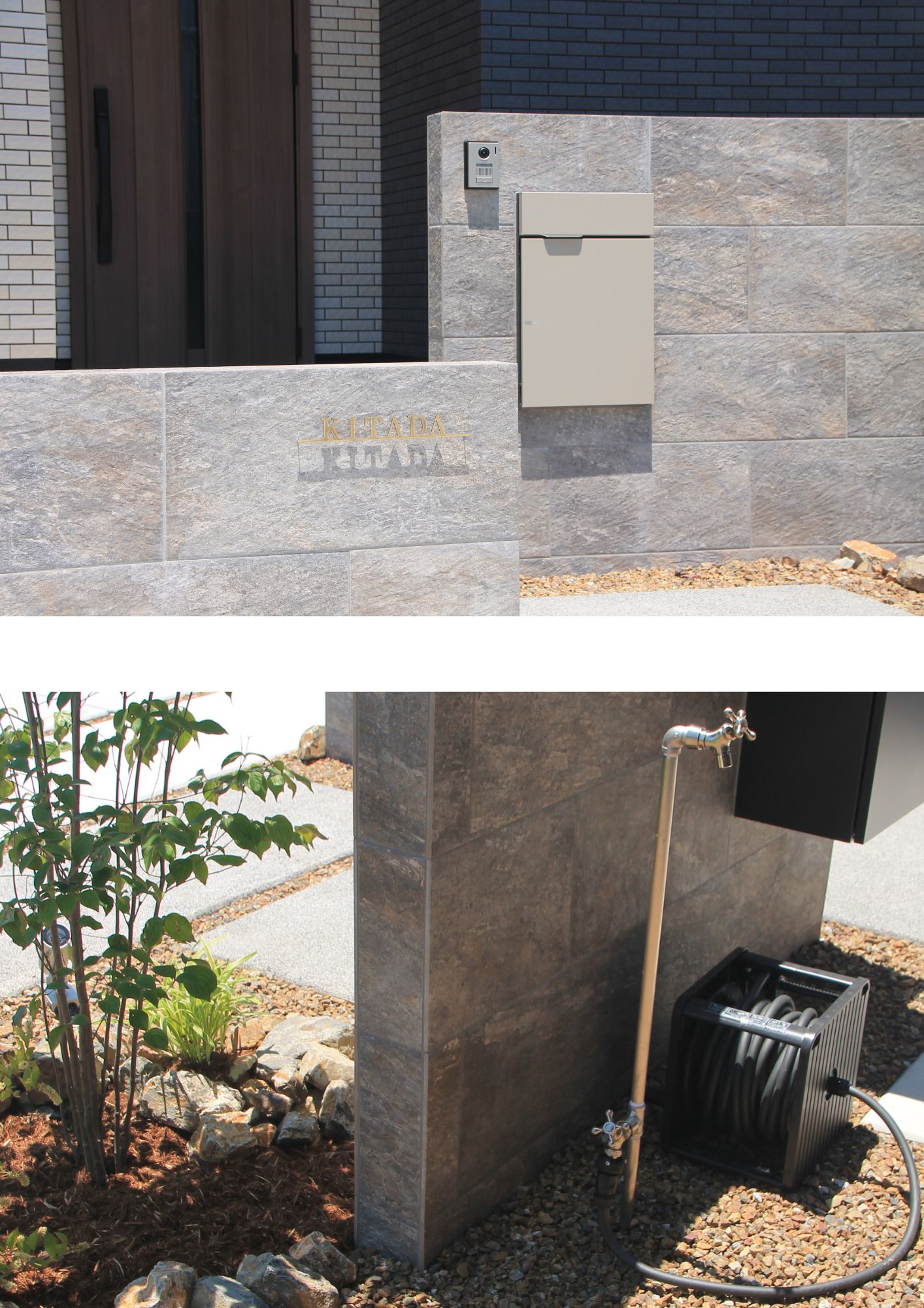高さの違う門袖でリズムを生み出したアプローチは、機能性だけでなく美観性も意識しています。