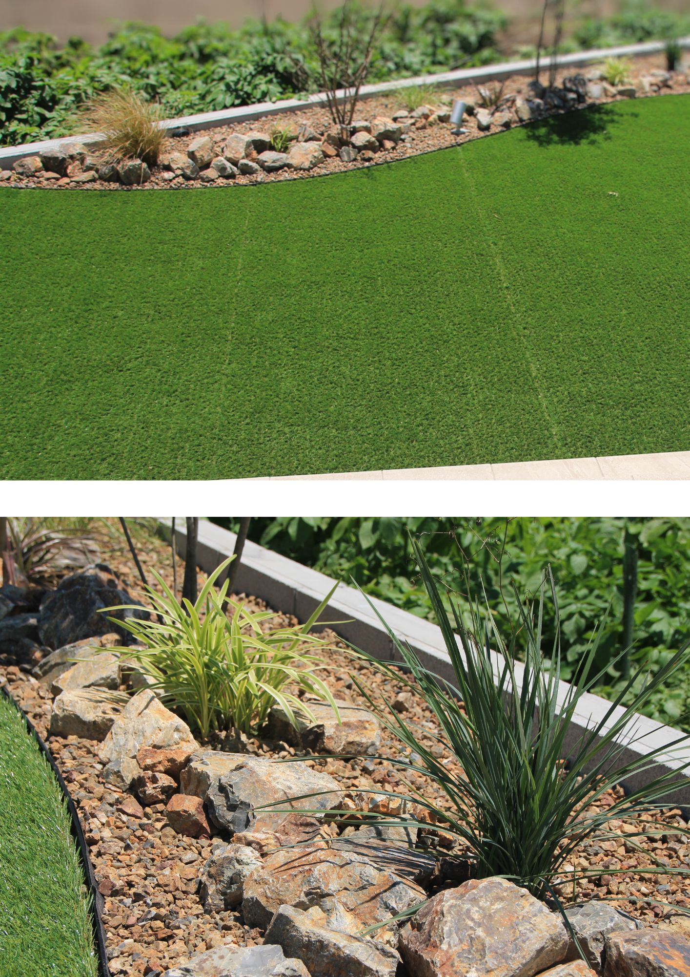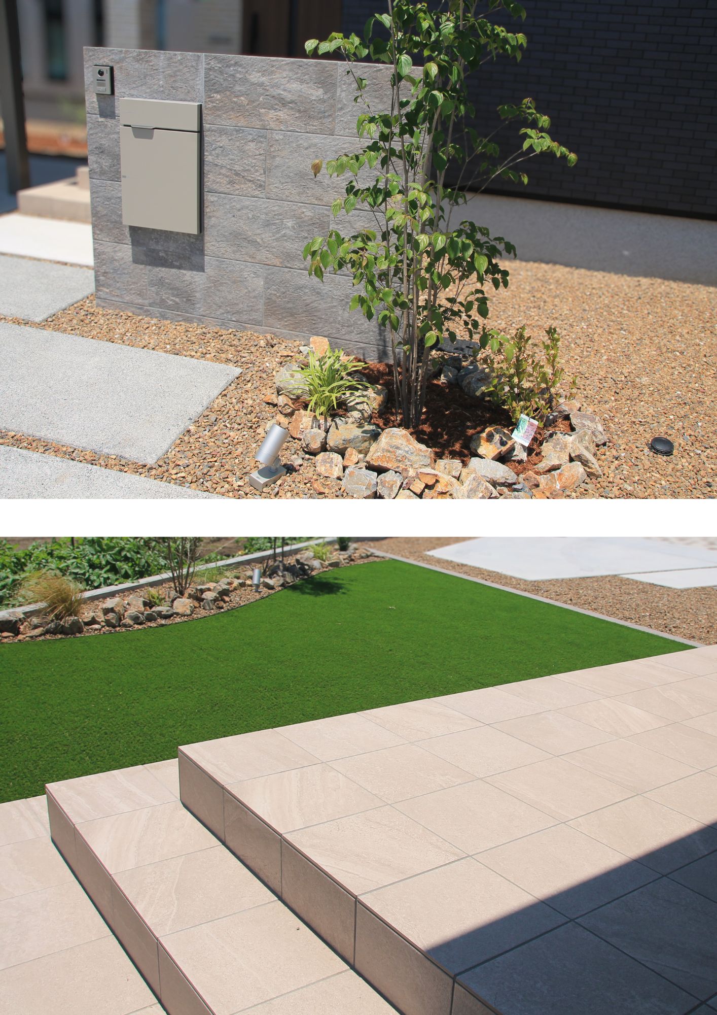 人工芝と砂利の見切り材は細いアルミの見切り材を使用し、違和感を軽減しました☺