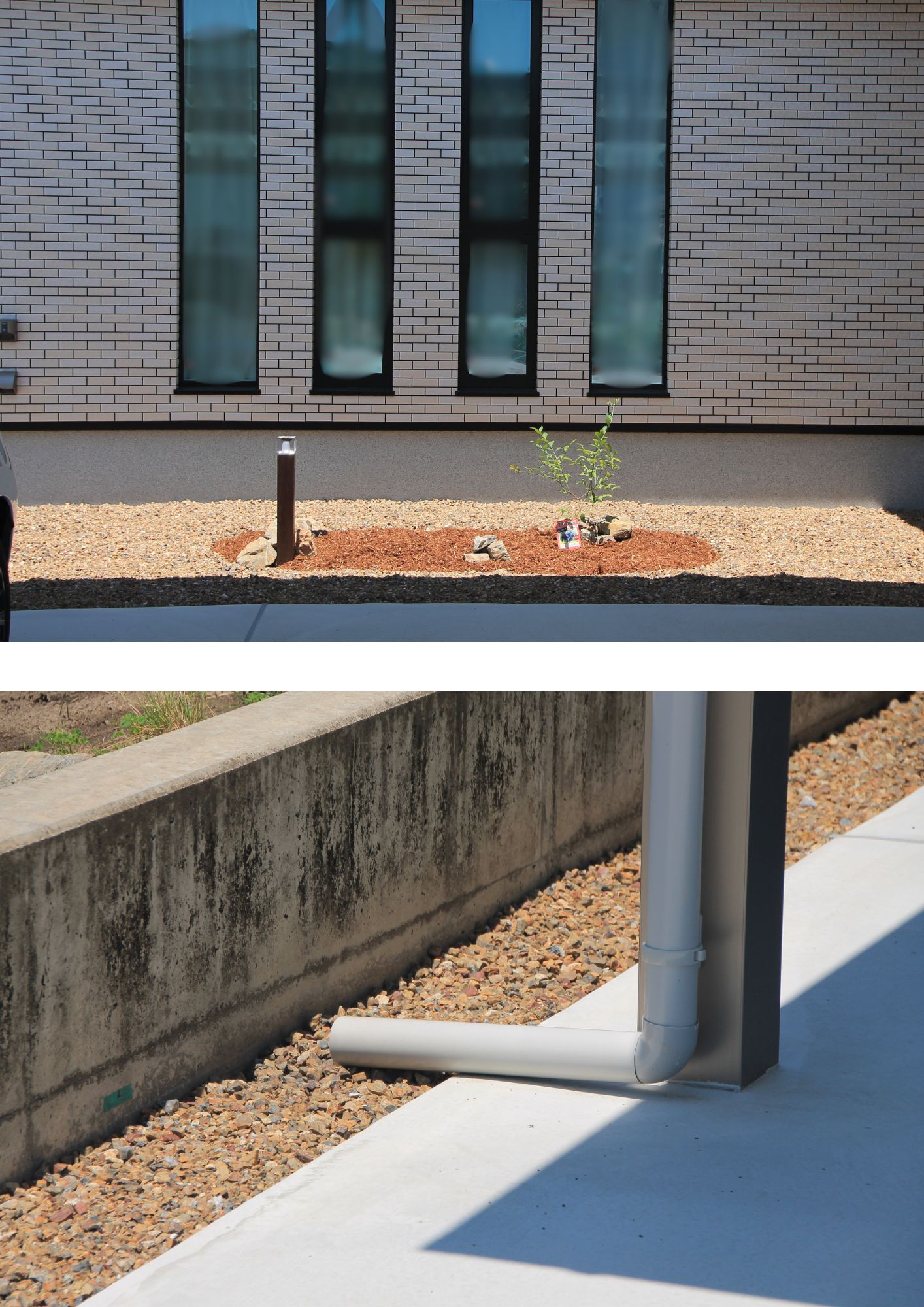 カーポートの樋は出口部分を長い物にしてスリットの砂利に流れるようにご提案。