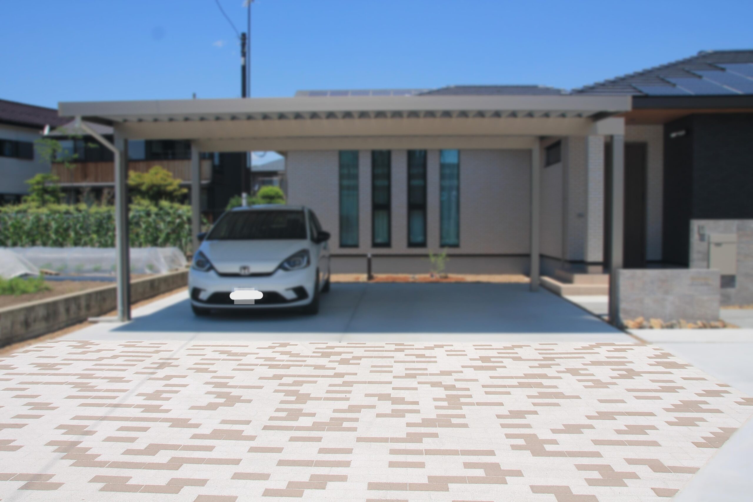 駐車場部分は土間コンクリートと勾配をとるのが難しかったので、そんな時でも安心な透水性のインターロッキングを採用しました。