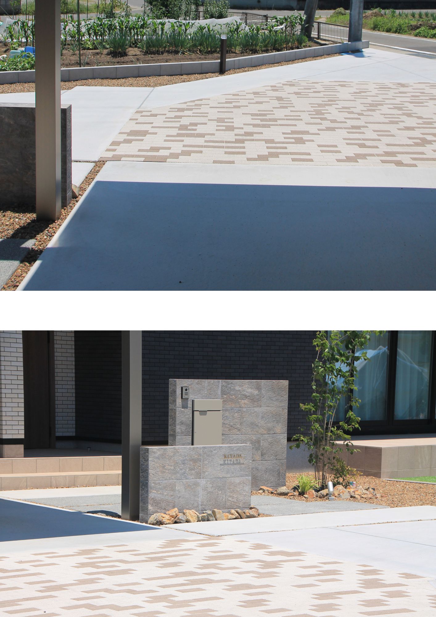 駐車場部分は土間コンクリートと勾配をとるのが難しかったので、そんな時でも安心な透水性のインターロッキングを採用しました。