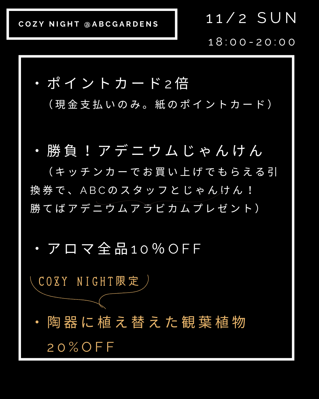 ・アデニウムじゃんけん(当日出店しているお店でお買い上げで引換券をお渡しします。引換券で当店スタッフとじゃんけん勝負!!勝つと、当店一押しアデニウムアラビカムをプレゼント!)